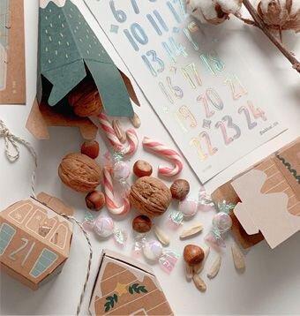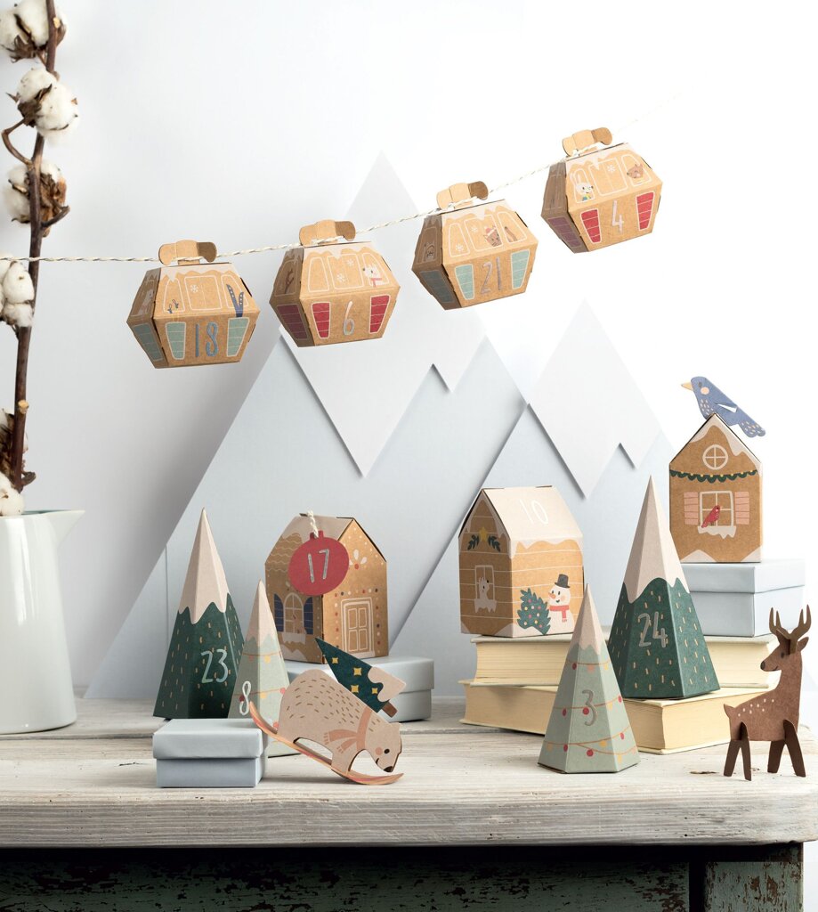 Adventný kalendár v podobe papierovej zasneženej dedinky. Zdobené papierové výseky, ktoré po zložení, poslúžia ako krásny dekoračný adventný kalendár.