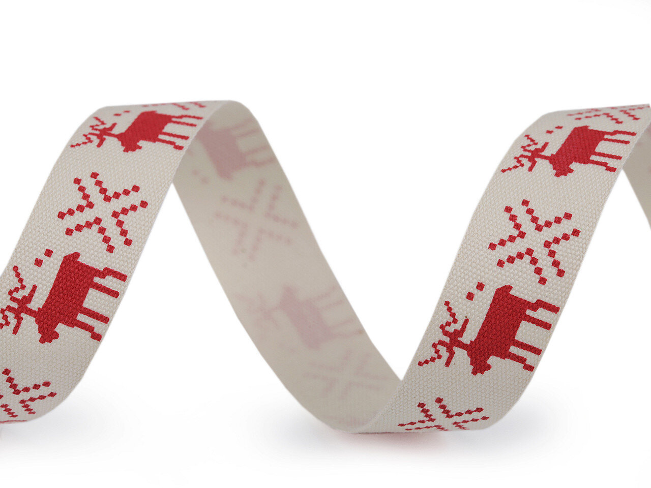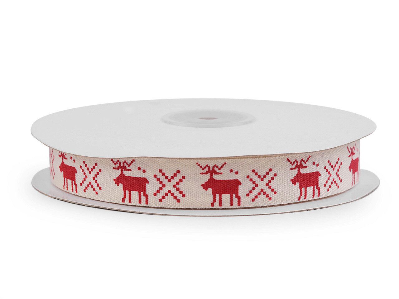 Bavlnená stuha v režnej farbe zdobená červenými sobmi. Stuha skvelá pre vianočné aranžmány a zdobenie darčekov. Stuha v šírke 15 mm a návidne 22,5 m.