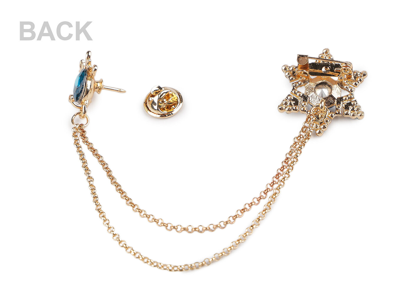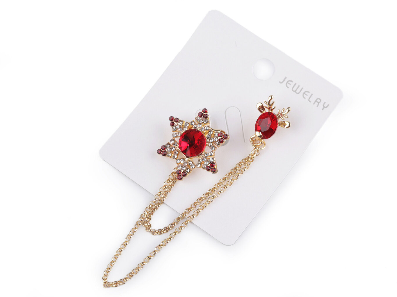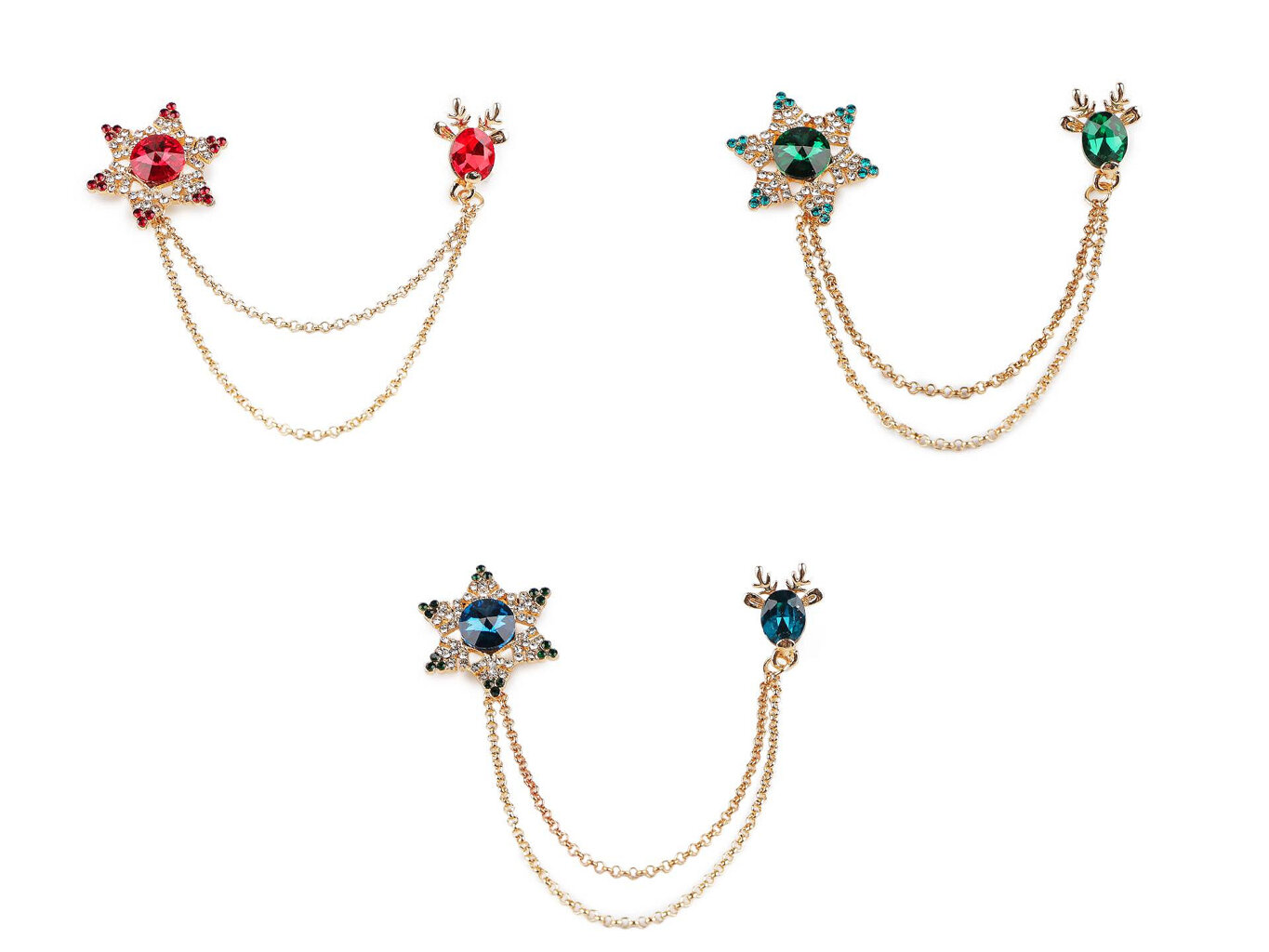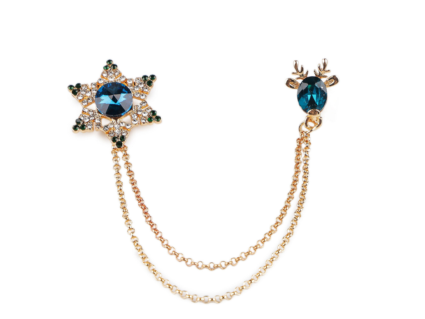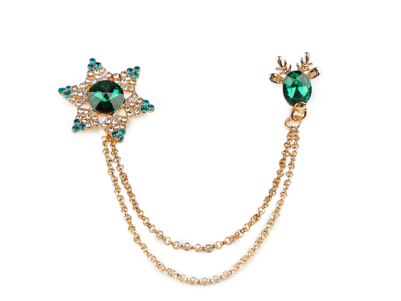 Brošňa, ktorá zaujme na prvý pohľad. Jemný a prepracovaný dizajn brošne, ktorá je zdobená brúsenými kamienkami. Brošňa má na jednej strane vločku a na strane druhej soba, oboje spojené retiazky. Dragoun oživí každý outfit. Skvelý doplnok na Vianoce aj iné slávnostné príležitosti. Zlatá brošňa s krásnymi brúsenými kamienkami v červenej, zelenej alebo modrej farbe. Brošňa je skvelý doplnok na blúzku, klopu pri saku či kabáte, klobúk, šatku a ďalšie. Nadchne každého kto má rád efektívne doplnky a kto rád vyniká.