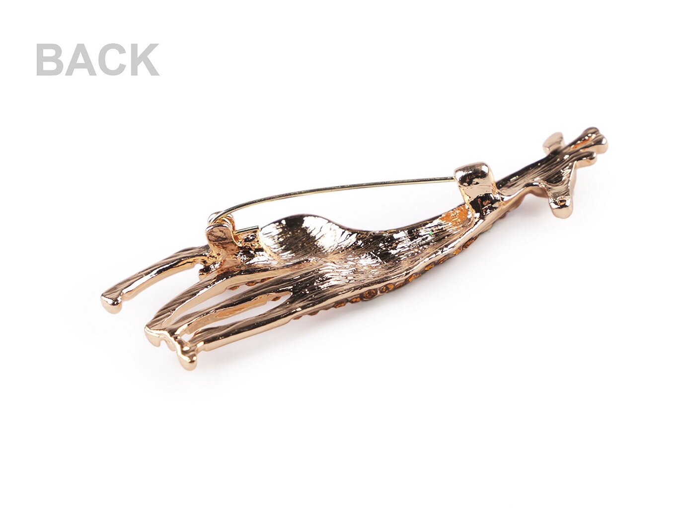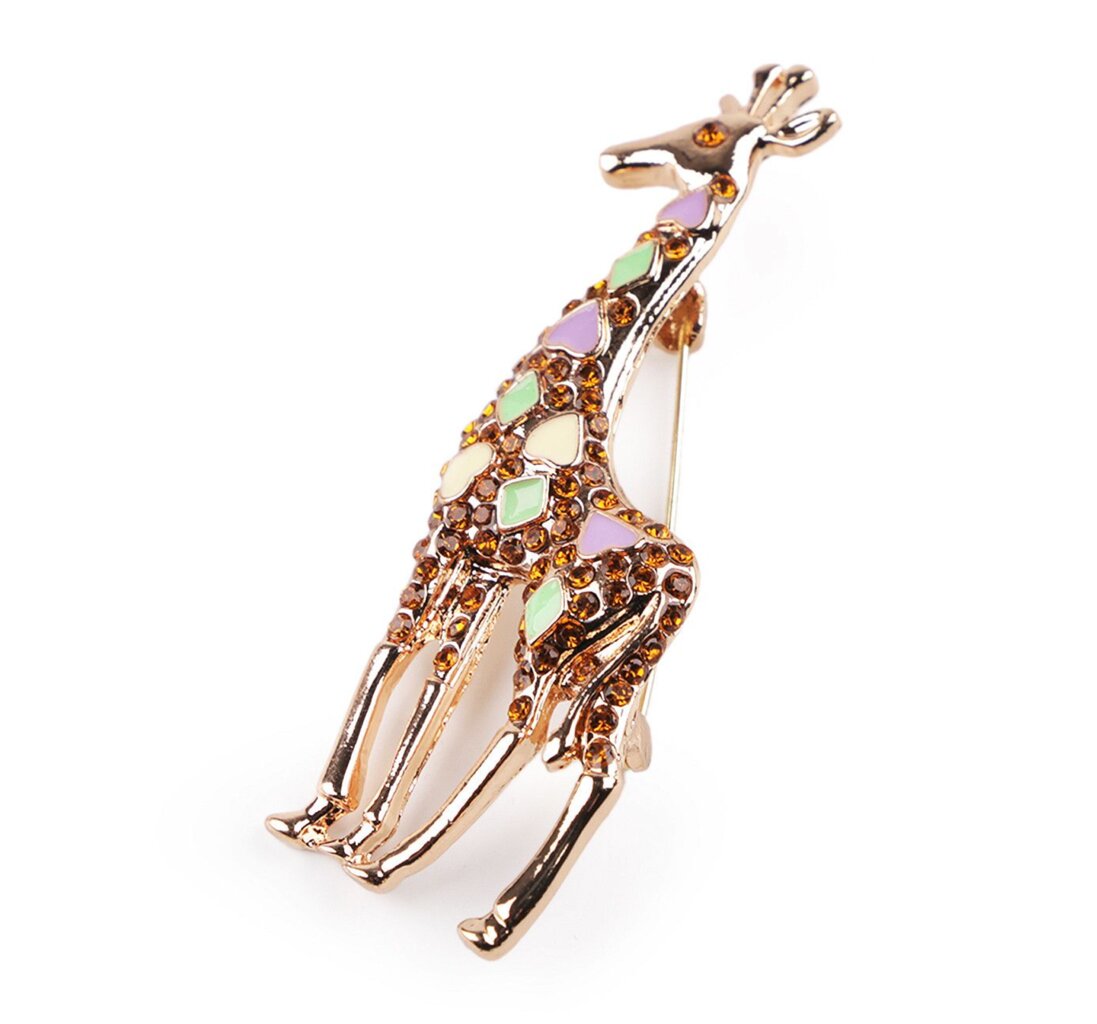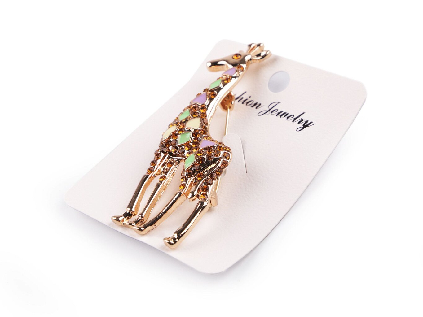 Brošňa v podobe žirafy je úplne originálnym doplnkom. Brošňa žirafa je zlatá a zdobená farebnými kamienkami, ktoré sú brúsené a brošňa sa tak efektívne trblieta. Brošňa je skvelým doplnkom Vašich odevov a hodí sa do divadiel, na oslavy a ďalšie akcie. Brošňa pôsobivo doladí odevy aj doplnky ako je kabelka, klobúk, šatka a iné. Brošňa sa zapína pomocou brošňového špendlíka.