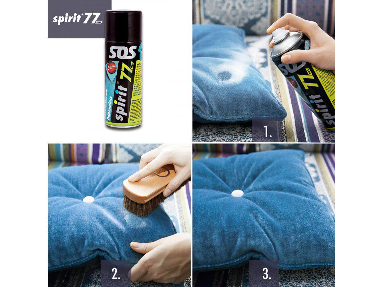 obchod@raj-sitia.skČistič škvŕn SPIRIT 77 MAX - spray 400 ml je veľmi účinný prípravok na odstránenie mastnosť, čerstvých škvŕn z oblečenia, čalúnenie a iných materiálov. Vyčistenie škvrny prebieha za sucha bez prania. Tento čistič škvŕn využijete v domácnosti a tiež v textilnom priemysle. Teraz už nebudete musieť čeliť nepríjemným situáciách s fliačikom na bielej košeli alebo nohaviciach, už nemusíte riešiť, ako nehodu s fliačikom zamaskovať, Spirit 77 je tu, aby Vám pomohol.
