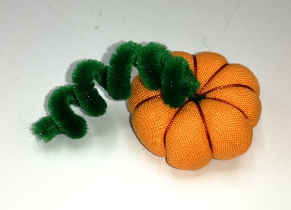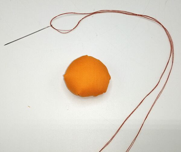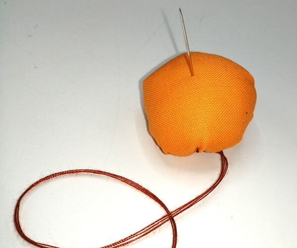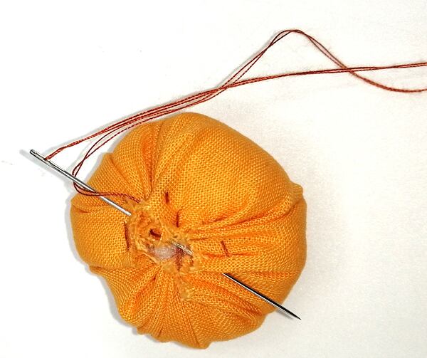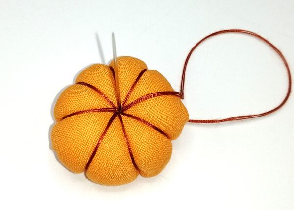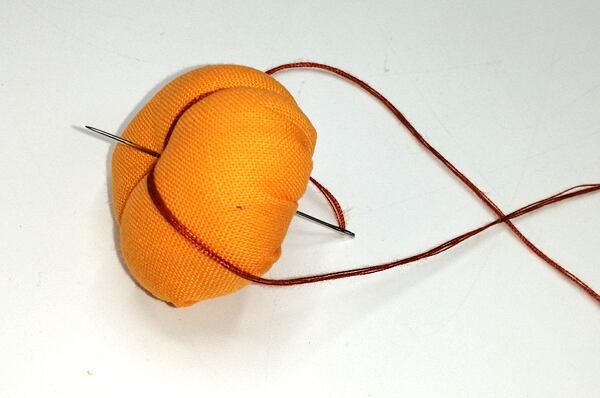 5. Navlékneme si silnější nit nebo více nití do jehly pro výraznější efekt. Jehlou propíchneme dýni uprostřed, postupujeme od zašité strany. Propíchneme skrz celou dýni na horní stranu a zase zapíchneme jehlu zespodu. Před dalším zapíchnutím nit utáhneme, aby se vytvořil patřičný efekt.
