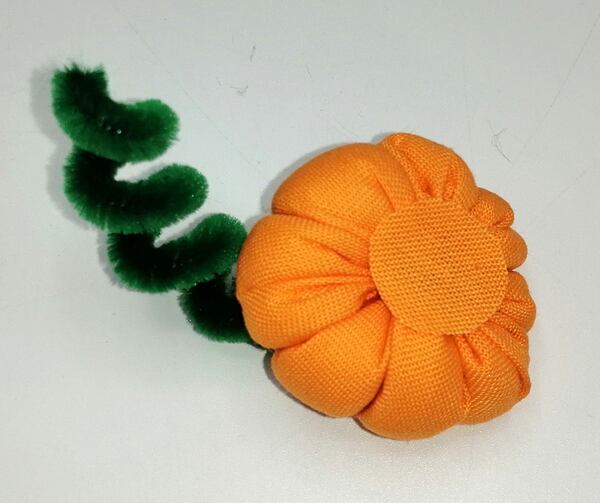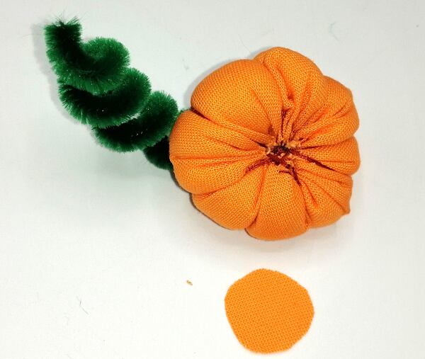 8. Na spodní, sešitou stranu, si vystřihneme malé kolečko. Vystřihnout můžete z papíru nebo stejného materiálu a přes nevzhledné šití jej nalepíme. Pokud dýni použijete pro další dekorace, třeba na věnec, kde dýni budete lepit přímo na věnec, tento postup můžete vynechat.