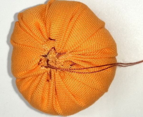 4. Nit postupně stahujeme až do úplného zatažení. Zbylým koncem nitě otvor zašijeme.