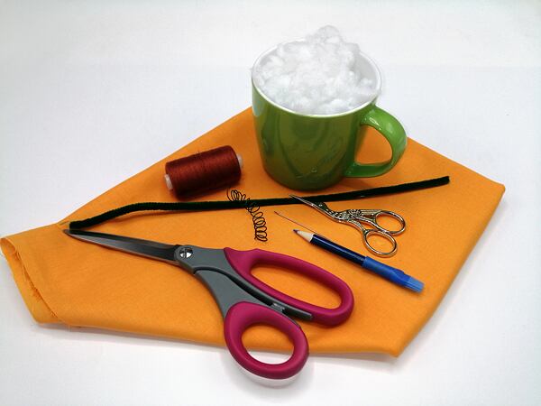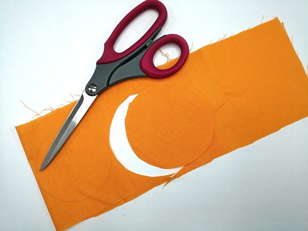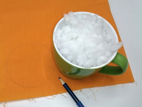 1. Připravíme materiál, ze kterého chceme dýni ušít. Vhodnější jsou měkčí materiály jako plátno nebo tričkovina, z filcu by dýně nešla vytvarovat. Podle hrnku, talíře a dalších kruhových předmětů, si obkreslíme tvar na látku a vystřihneme.