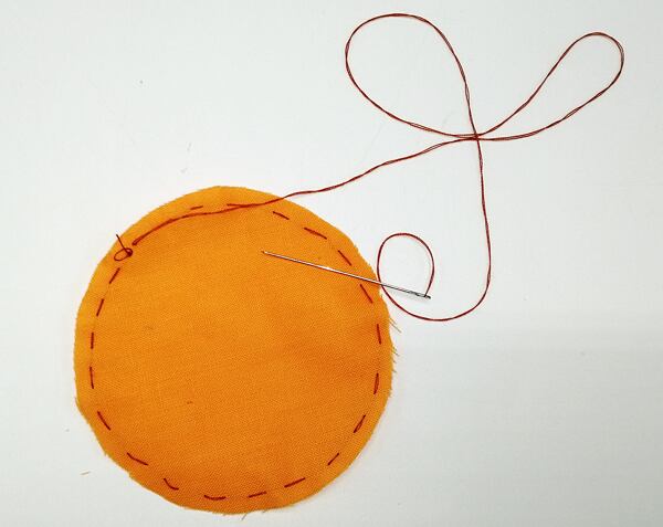 2. Po obvodu prošijeme kolečko, kousek od okraje, předním stehem. Do jehly navlečeme nit dvojitě, aby se při stahování nepřetrhla. Po prostehování za konec zatáhneme a tím si kolečko stáhneme. Nit ještě neodstřiháváme, budeme ji potřebovat.