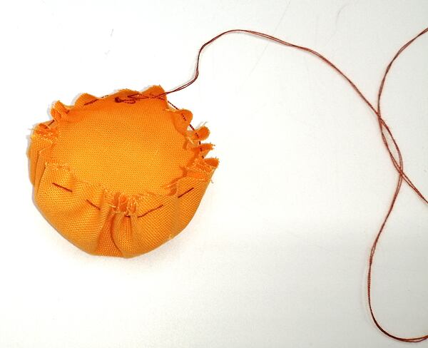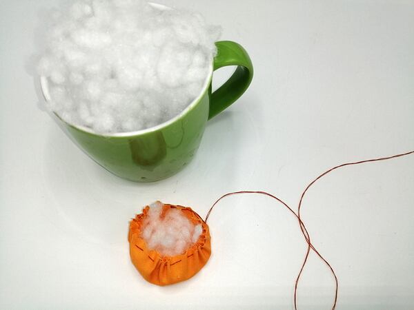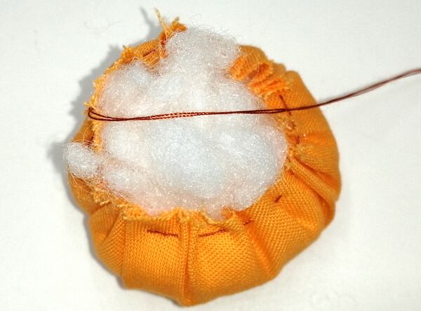 3. Stažené kolečko vyplníme dutým vláknem (výplní do polštářů) a mezitím pořád utahujeme staženou nit.