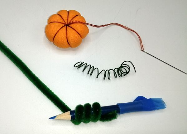 7. Připravíme si stonek. Žinylkový drátek nebo aranžérský drátek obtočíme kolem tužky a stáhneme. Vytvoří se nám krásná spirálka. Drátek můžete pro jistotu přišít ponechanou nití. Dobře zapošijeme a nit můžeme odstřihnout.
