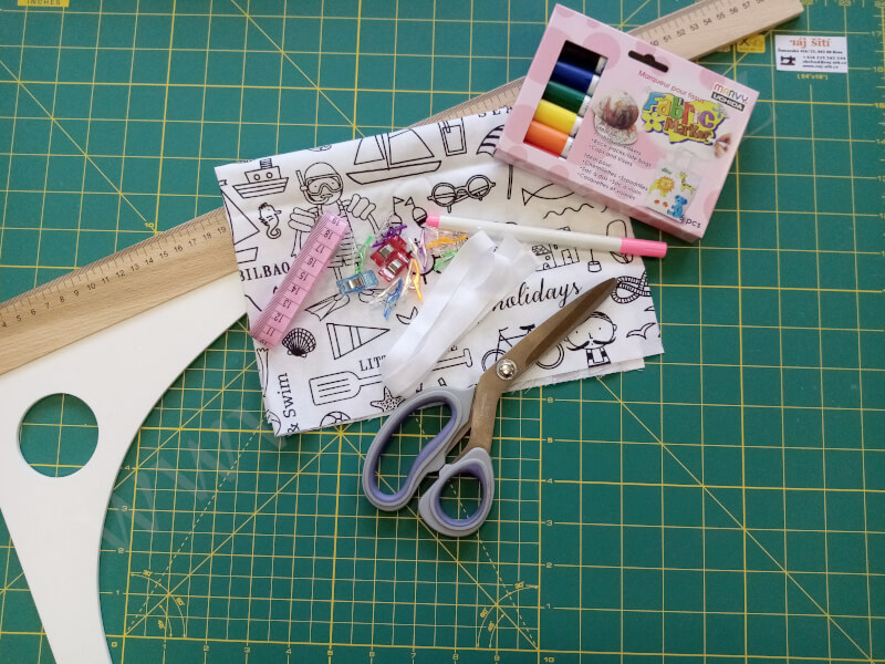 - Připravíme si materiál a potřebné pomůcky, které jsme pořídili třeba na Ráji šití. Z materiálu si nůžkami ustřihneme obdélník 50 cm na šířku a 35 cm na délku.