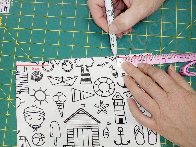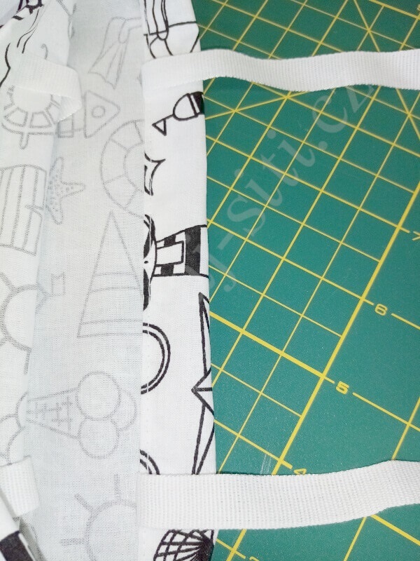 - Pod zahnutý okraj vložíme keprovku (ucho na nošení) 6 cm od okraje na obou stranách. Prošijeme na šicím stroji 1 mm od podehnutého okraje.