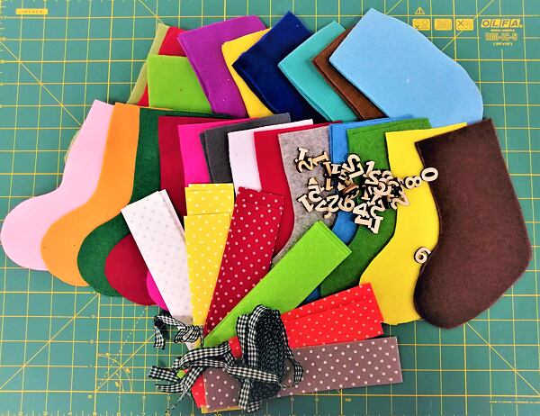 - Plsť - filc, flis (nebo jiné netřepivé materiály) - na 24 punčoch budete potřebovat 2 balení plsti a 1 balení na manžetky