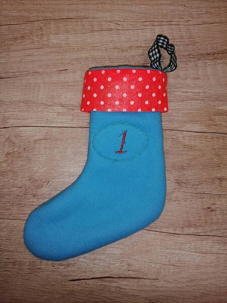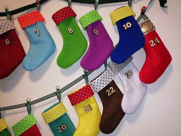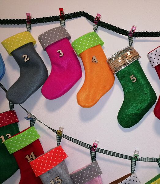 Tip: Punčochu číslo 5 a punčochu číslo 24 jsme olemovali třpytivou manžetou. Punčochy na dny, kdy naděluje Mikuláš a Ježíšek jsou tak zvýrazněny.