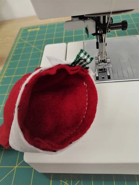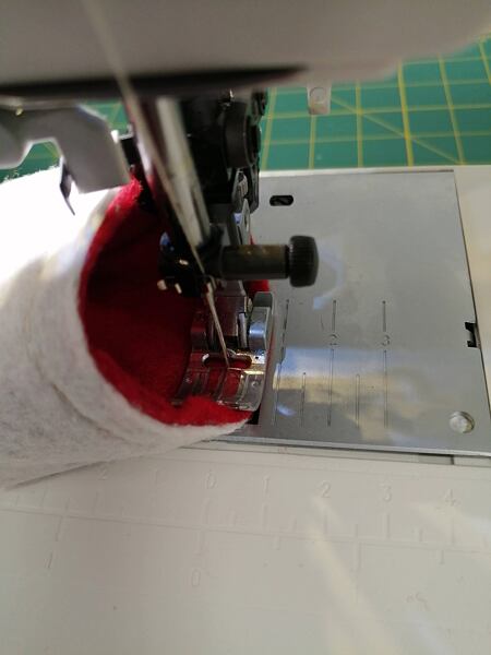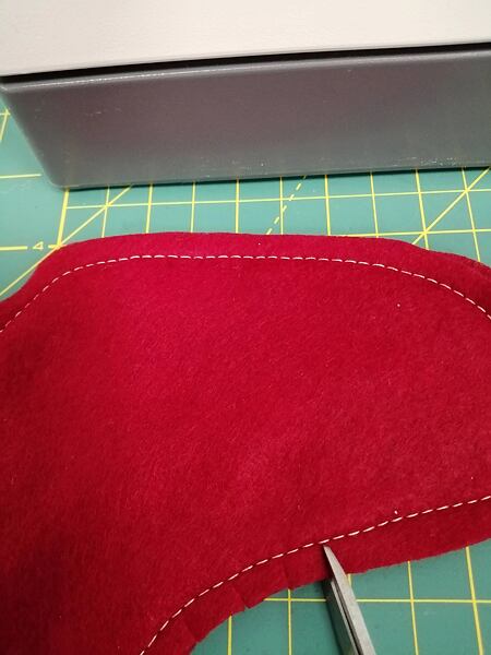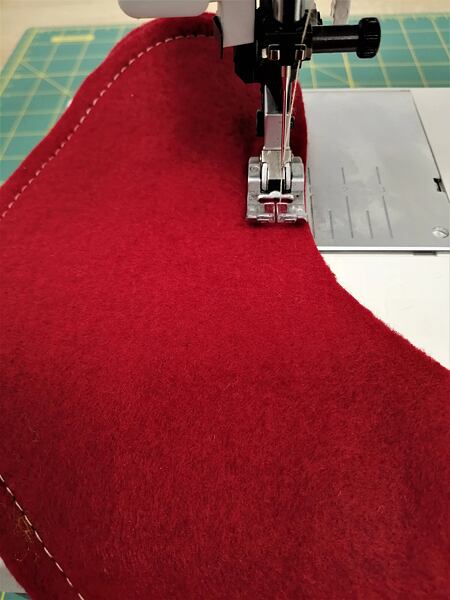 2. Punčochu po celém obvodu sešijeme na šicím stroji za okrajem 0,5 cm. V ohybech a oblinách nůžkami nastřihneme, aby se švy pěkně poskládaly.