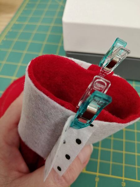 4. Švy rozložíme a na rubovou stranu přiložíme lícovou stranu proužku. Šev proužku umístíme na zadní šev punčochy, mezi švy vložíme stužku o délce 8 cm složenou na polovinu (poutko na zavěšení). Zajistíme si špendlíky nebo svorkami.
