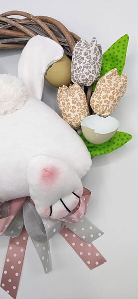 Teď už stačí jen dobarvit zajíčkovi polštářky na tlapkách růžovými stíny nebo pastelkou. Tlapky na tělo přišijeme nebo přilepíme tavnou pistolí. Stejným způsobem připevníme zajíčka na věnec a věnec dozdobíme. Jaké použijete b