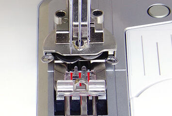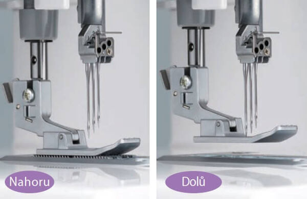 Coverlock Baby Lock Primo BLP6: pri zdvihnutí pätky sa automaticky zasunú zúbky podávača pod stehovú dosku a vy si môžete pohodlne nastaviť začiatok šitia. Po spustení pätky sa zase podávač automaticky zaktivuje.