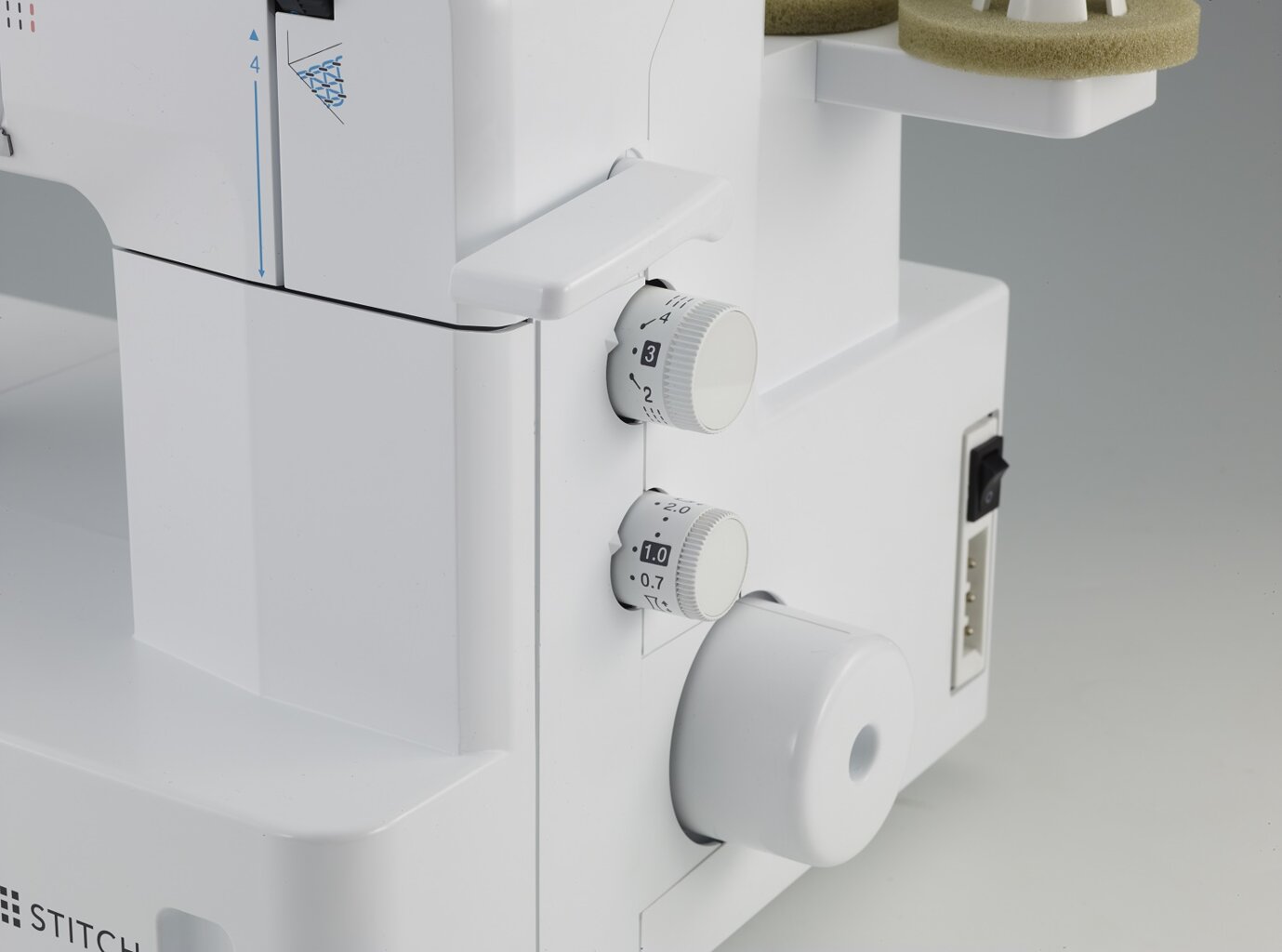 - Otočný ovládač pre dĺžku stehu, posuvný ovládač pre nastavenie diferenciálu - na pravej strane