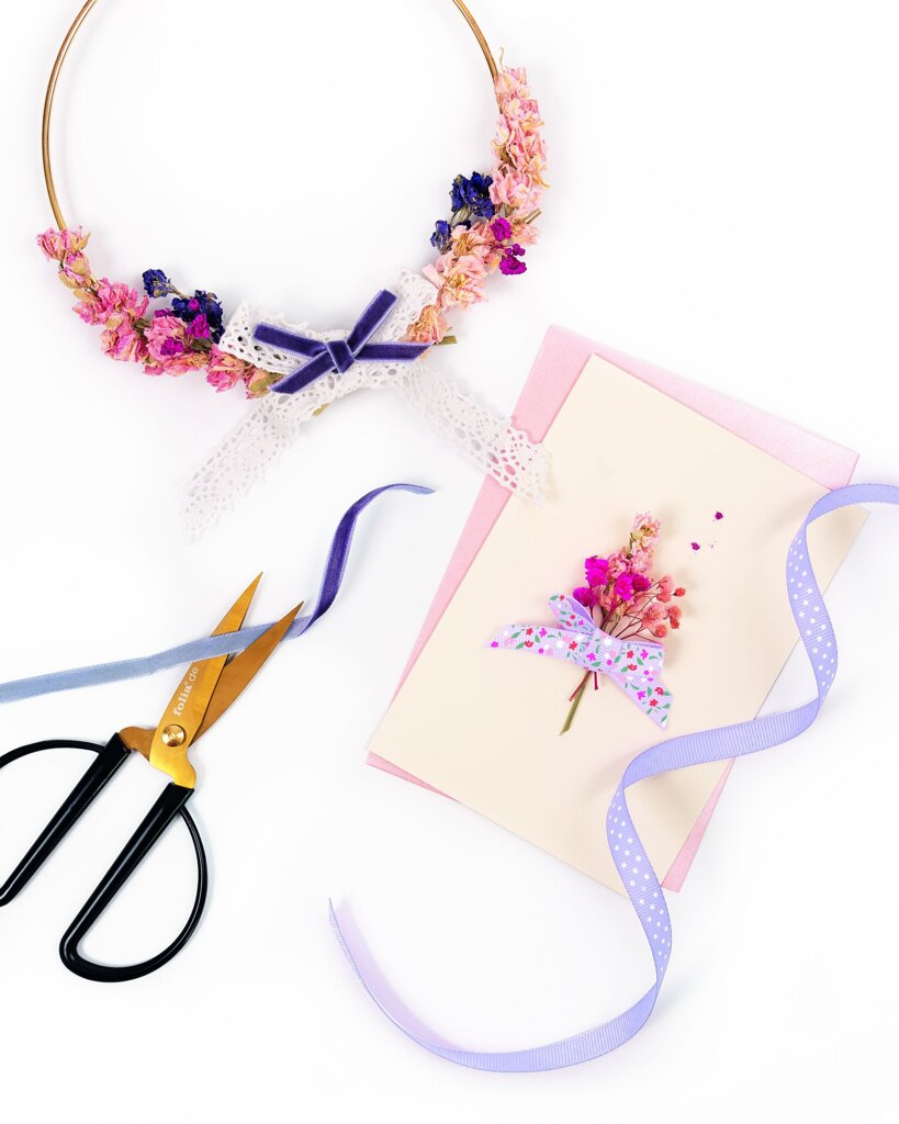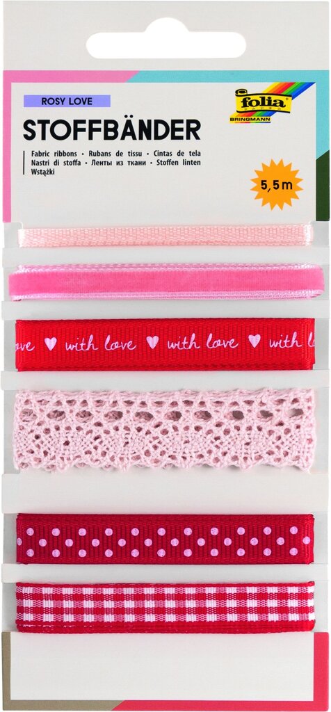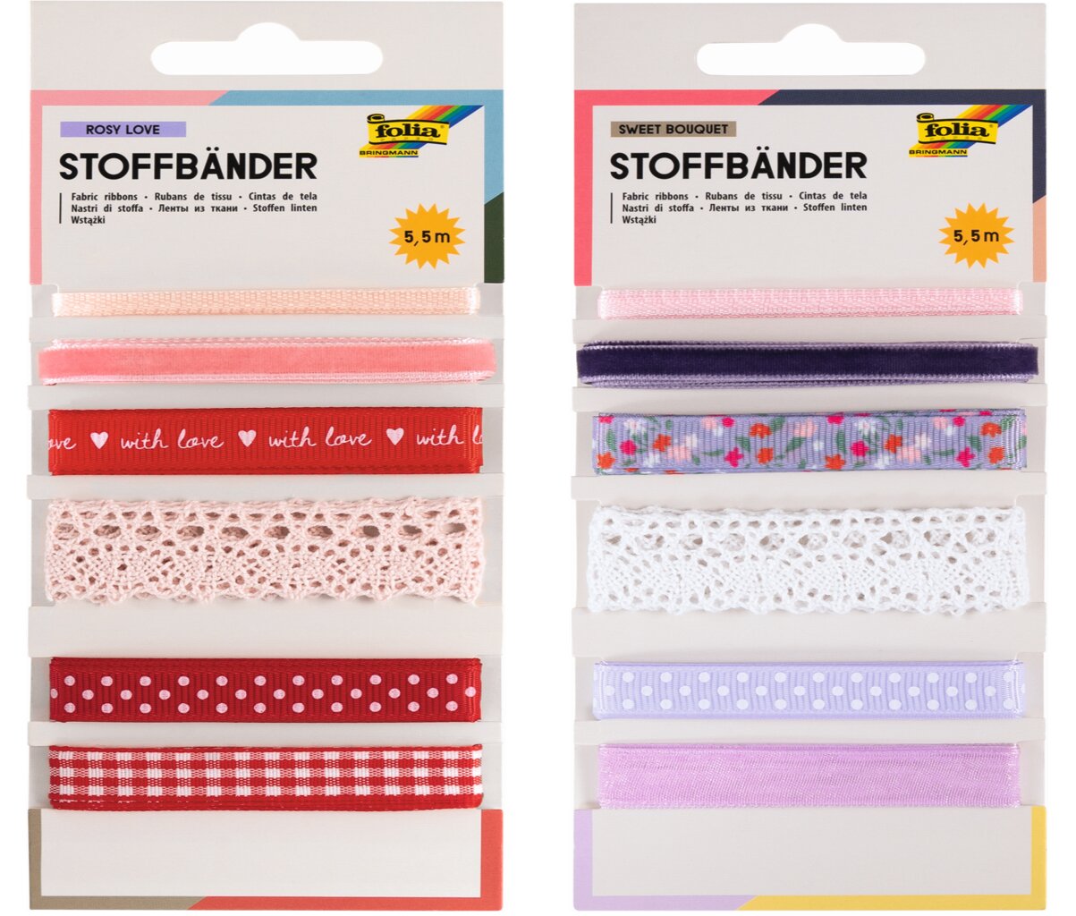 - 1x saténová stuha, 1 x zamatová stuha, 1x háčkovaná čipka, 3 x látková stuha s dizajnom