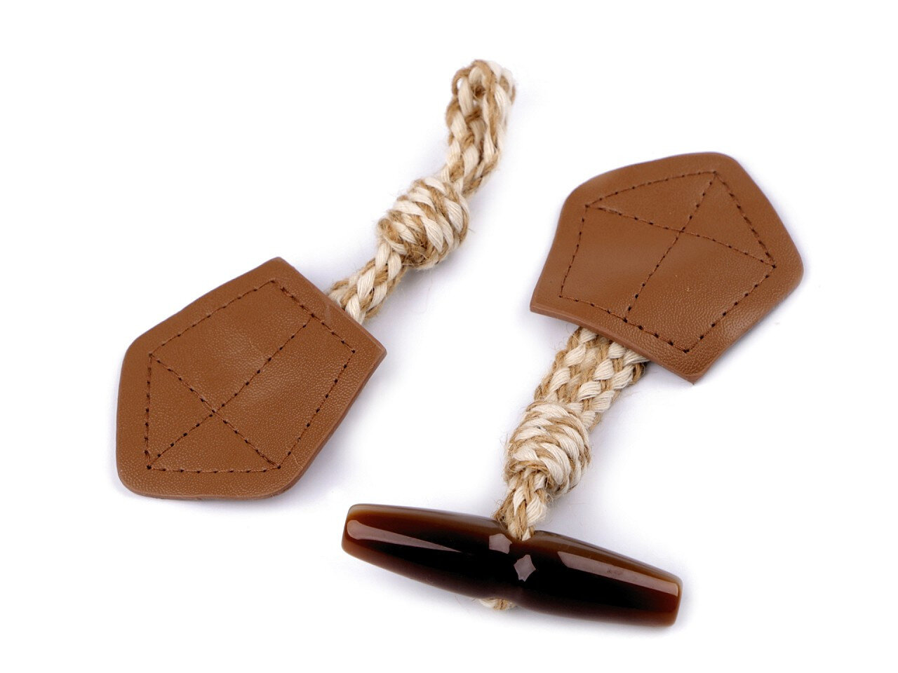 Zapínání z eko kůže v hnědé barvě s knoflíkem typu oliva. Výrazné zapínání perfektně doladí zimní kabáty, vesty, svetry, kardigany nebo kožichy. Je vhodné také pro šití duffle coat. Šňůra je dvoubarevná - proplétá se bavlna s jutou.