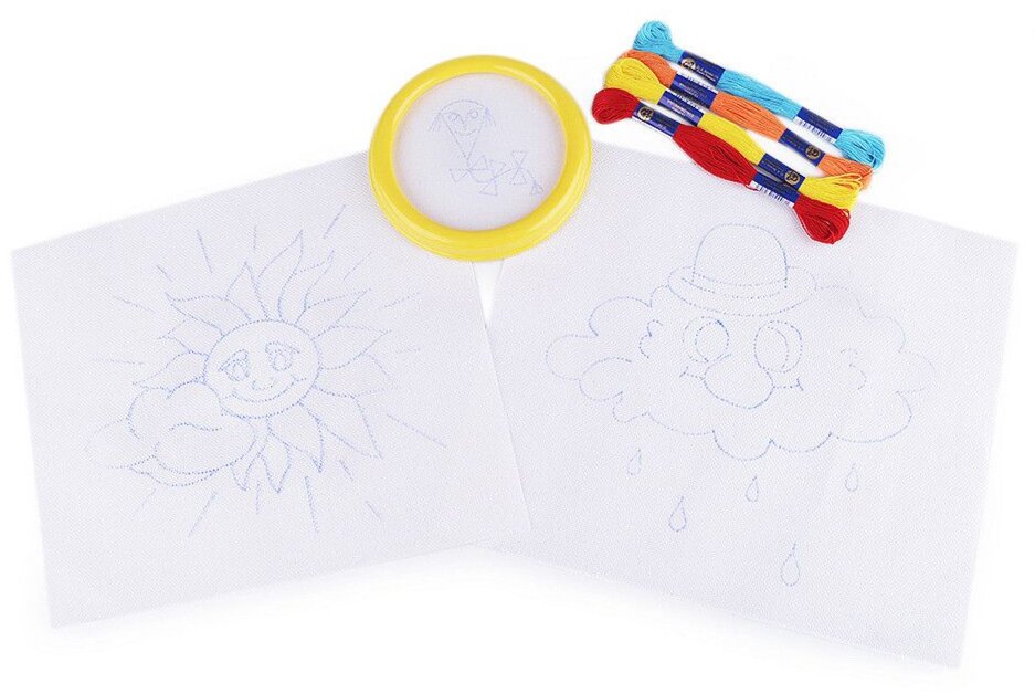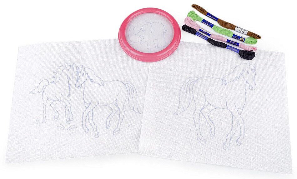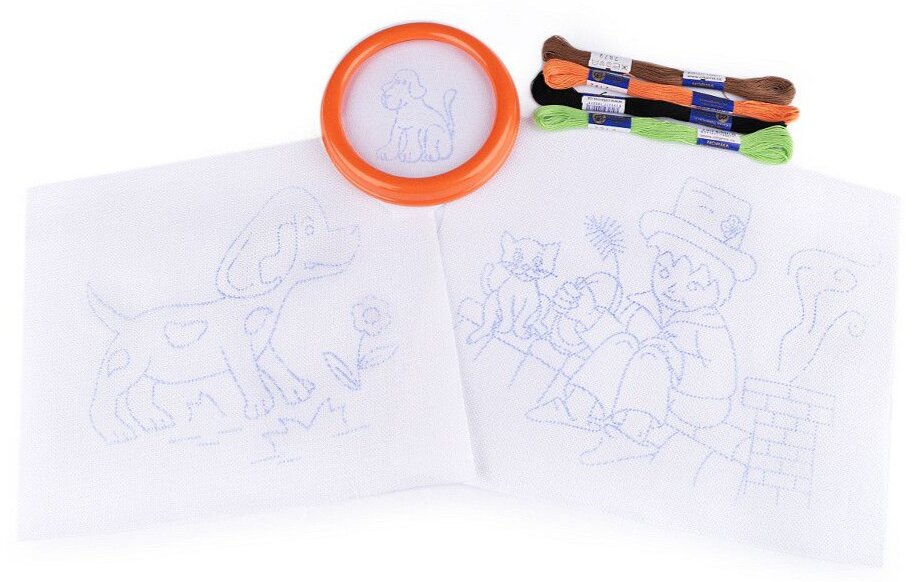 Krásné motivy pro dětské vyšívání spolu s vyšívacím kruhem a vyšívacími bavlnkami mouline. Zábavné tvoření spolu s dětskou vyšívací sadou.