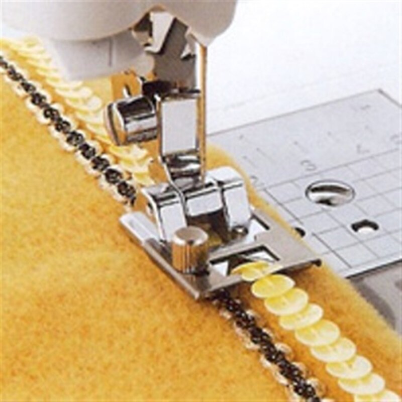 Pätka na prišívanie flitrov je originálna pätka Brother. Vhodná na ozdobenie šitého dielu našitím stužky či flitrov so šírkou až 5 mm.