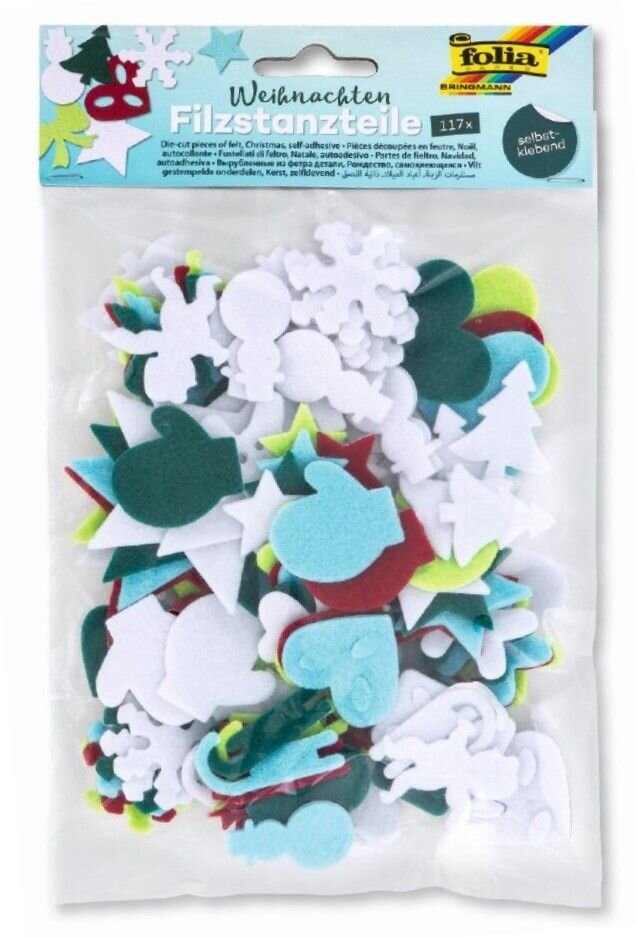 obchod@raj-sitia.skFilcové výseky samolepiace (117ks) - Vianočné motívy je balenie 117 kusov tvarov s vianočnou tématikou. Nádherné filcové výseky s ktorými vytvoríte vkusné vianočné dekorácie. V balení sú tvary vianočných motívov v rôznych farbách. Filcové výseky sú vhodné na dekoratívne tvorenie, scrapbooking, zdobenie pozvánok, rámčekov, darčekov.