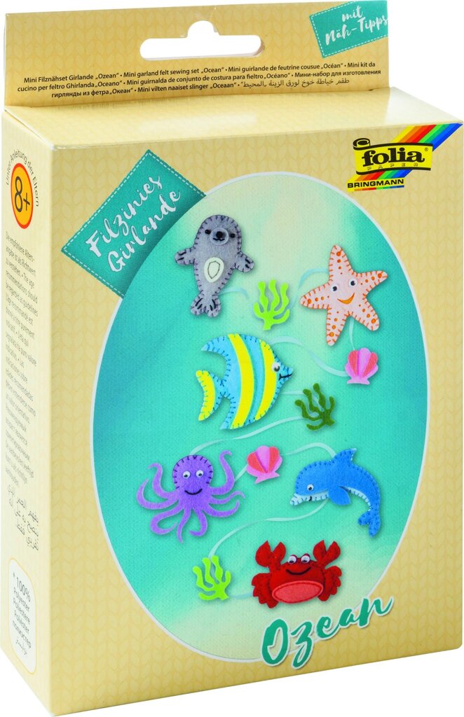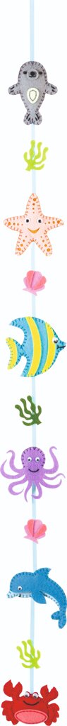 Filcová sada na výrobu girlandy. Jednotlivé diely postavičiek z oceánu sú už vystrihnuté a majú dierky určené na šitie. Vytvoriť si girlandu z filca je tak veľmi jednoduché. Vyrobená girlanda má rozmer 105 cm. Deti si vyhrajú a vytvoria si krásnu a veselú dekoráciu do izbičky.