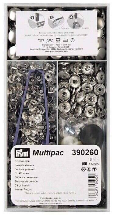 Multipack, ktorý obsahuje 100 kusov stláčacích gombíkov ANORAK s priemerom 15 mm v prevedení nikel od značky PRYM.