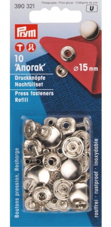 Gombík stláčací ANORAK - PRYM - je balenie 10 ks kovových stláčacích gombíkov ANORAK v rôznych farbách a priemeroch.