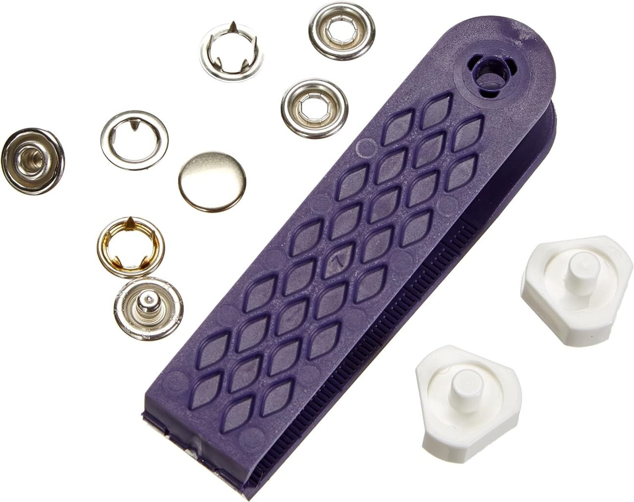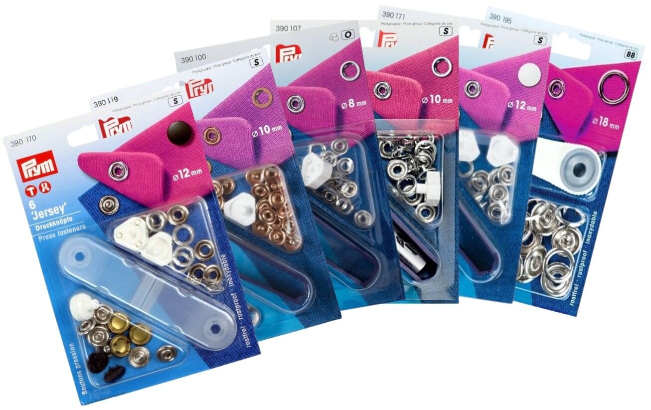 Stláčacie gombíky Jersey s priemerom 8 mm, 10 mm a niektoré 12 mm je možné aplikovať pomocou kladiva, trojnožky a klieští Vario. Nástavce na aplikáciu kliešťami či trojnožkou sú súčasťou balenia.