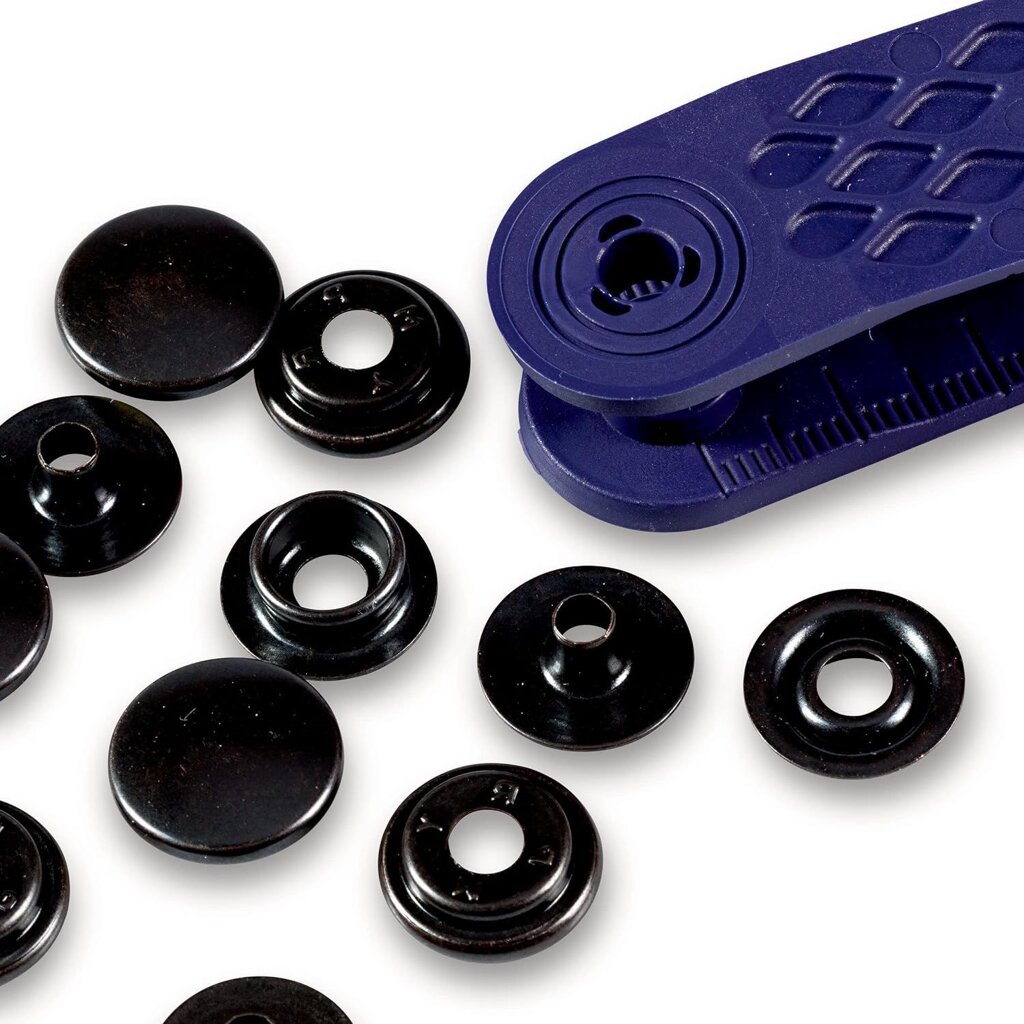 Stláčacie gombíky SPORT A CAMPING aplikujete jednoducho pomocou kladiva, trojnožky alebo klieští Vario, nástavce pre kliešte Vario sú súčasťou balenia.