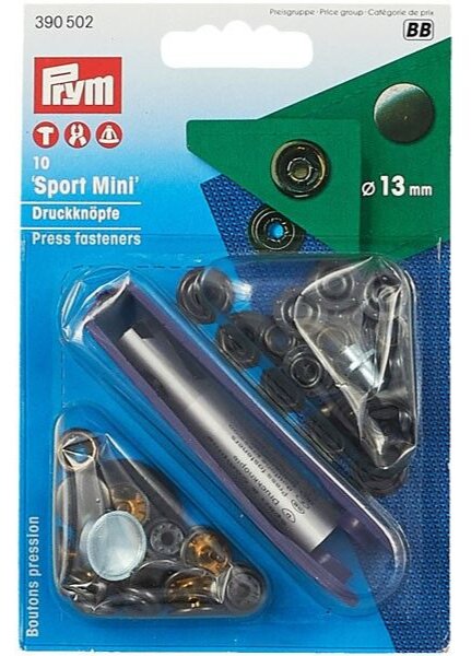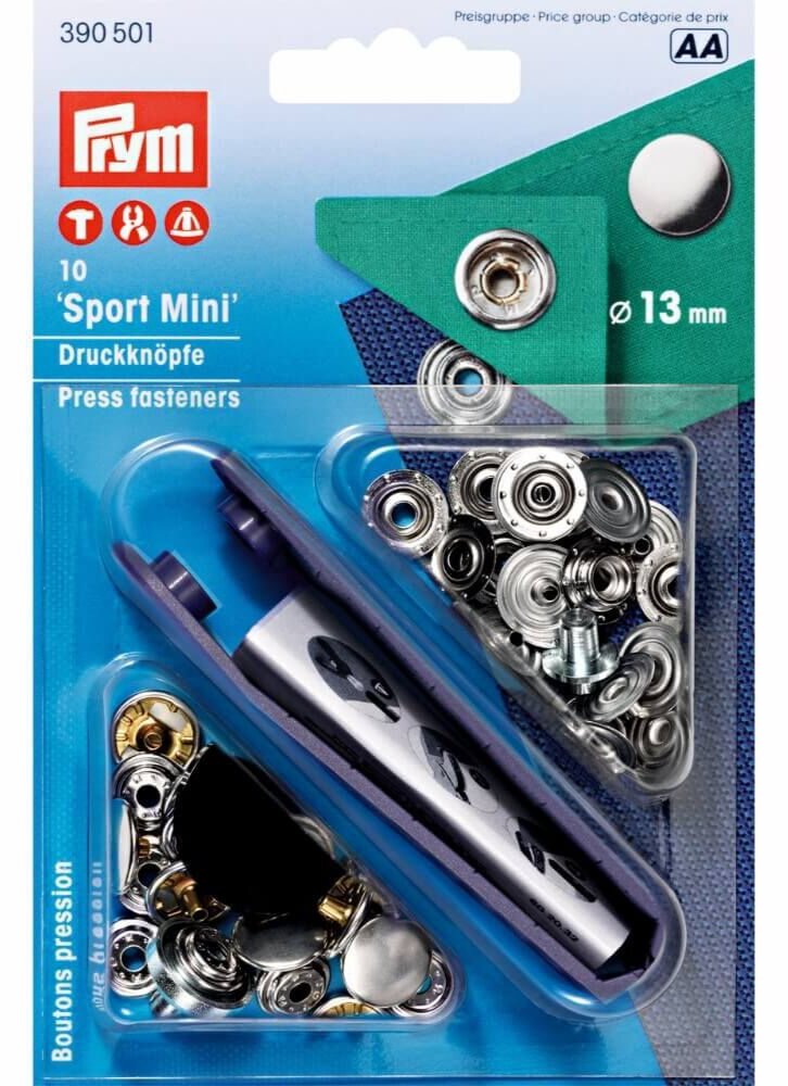 Gombík stláčací SPORT MINI - PRYM je balenie kovových stláčacích gombíkov SPORT MINI s priemerom 13 mm s aplikátorom.