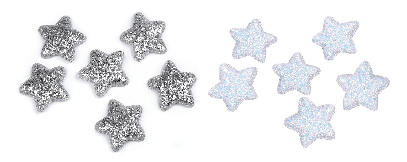 Trblietavé vianočné hviezdy, ktoré majú široké možnosti využitia. Môžete s nimi ozdobiť vianočné vence, štedrovečerný stôl a iné vianočné dekorácie. Hviezdy sa dajú lepiť tavnou pištoľou aj šiť na textilný podklad. Hviezdy majú flitre z jednej strany, zo strany druhej je nezdobená textília.