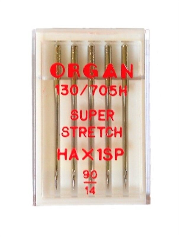 Ihly Organ 130/705 H a HAx1 SP (5x90) Super Stretch sú určené pre overlocky, ktoré majú v návode označenie ihiel 130/705 H a HA x 1 SP. Balenie obsahuje 5 ks ihiel veľkosti 90. Ihly sú vhodné aj na šitie extra pružných materiálov
