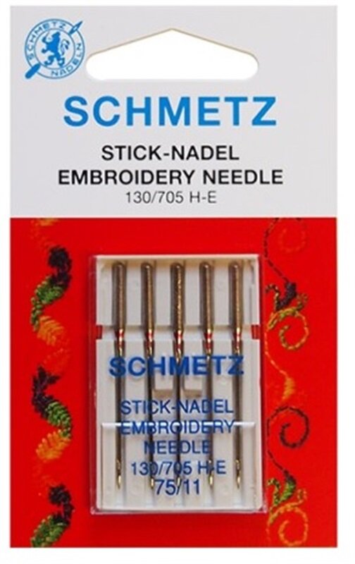 obchod@raj-sitia.skIhly Schmetz 130/705 HE VMS embroidery 5x75 - vyšívacie ihly sú špeciálne vyšívacie ihly o sile 75 na vyšívanie metalickými a inými špeciálnymi niťami na vyšívanie. Ihly majú väčšie očko a sú vhodné pre väčšinu domácich vyšívacích strojov.