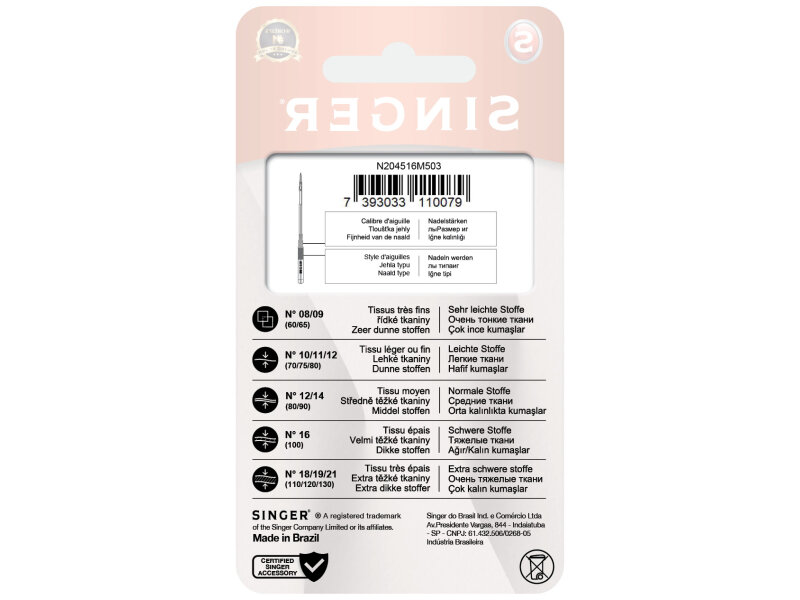 Ihly sú špeciálne určené iba pre šijacie stroje Singer, nepoužívajte do iných značiek strojov, mohlo by dôjsť k zlomeniu ihly či poškodeniu stroja.