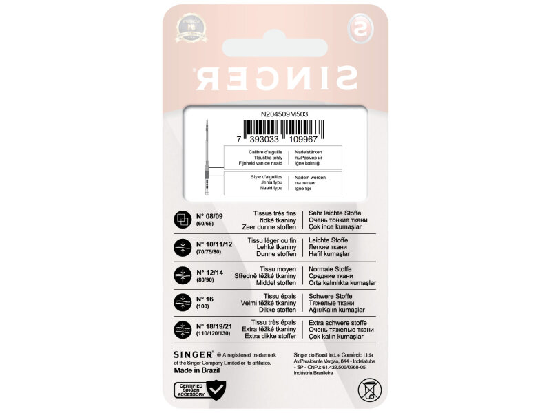 Ihly sú špeciálne určené iba pre šijacie stroje Singer, nepoužívajte do iných značiek strojov, mohlo by dôjsť k zlomeniu ihly či poškodeniu stroja.