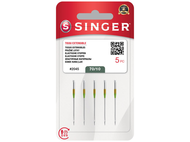 Ihly Singer 2045 - pre šijacie stroje - stretch (5x70) je sada 5 ks stretchových ihiel o sile 70. Tieto ihly sú vhodné pre všetky šijacie stroje značky Singer.