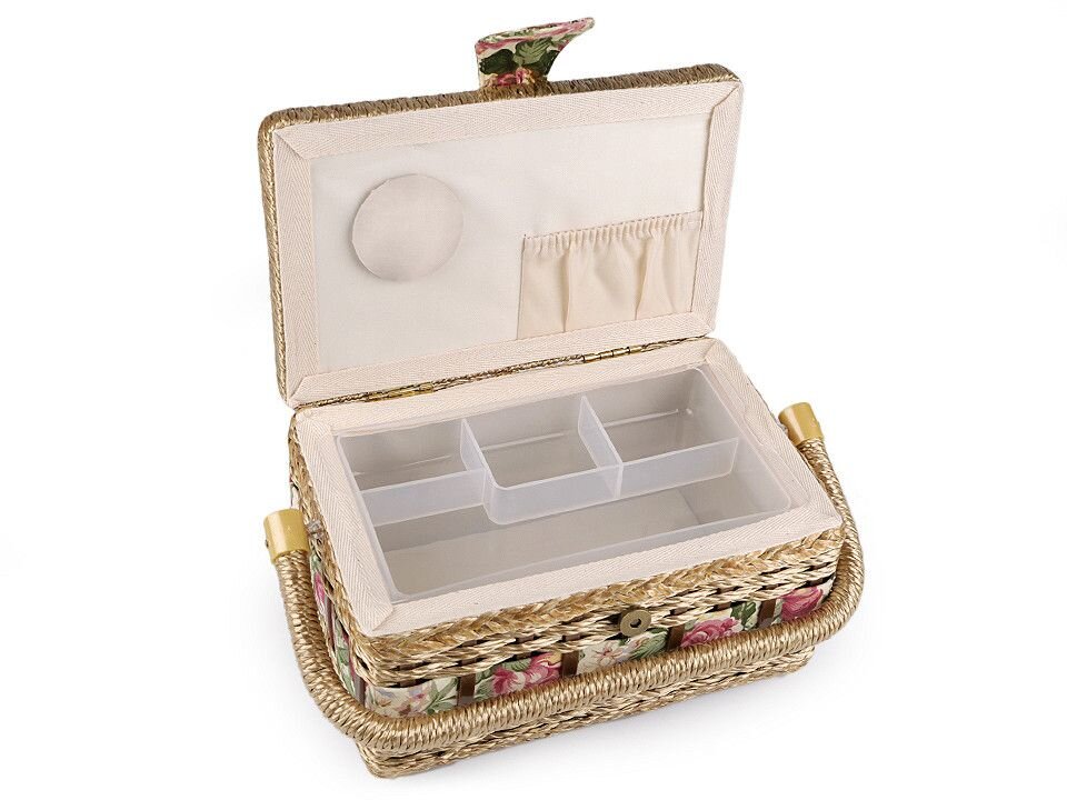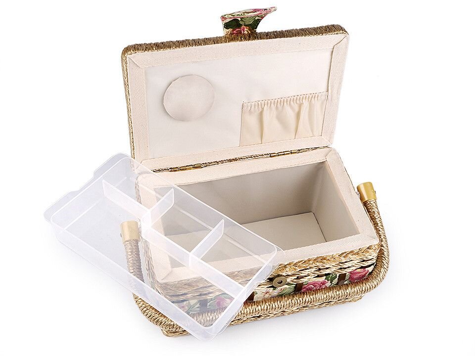 Čalúnený box v krásnom dizajne, ktorý jednoducho schová všetky potreby na šitie, či už ručné alebo strojové. Vnútri košíka je vsadené plastové poschodie so štyrmi priehradkami, ktoré je možné jednoducho vybrať. Košík má zapínanie na magnet a vďaka pevnému uchu ho môžete ľahko prenášať. Na vnútornej strane veka nájdete praktický ihelníček a vrecko na umiestnenie príručných nožníc.
