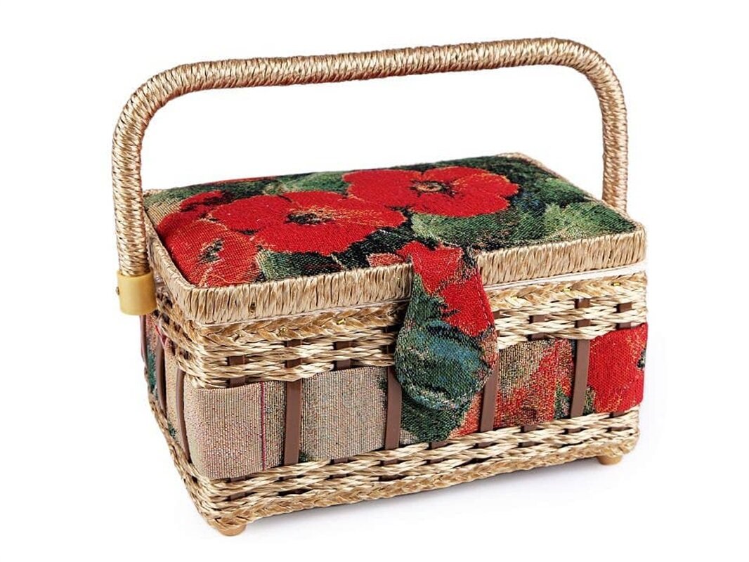 Košík na šijacie potreby so vzorom vlčích makov je praktický košík, do ktorého uložíte všetky potreby na šitie. Je praktický a pritom elegantný. Čalúnený box na príslušenstvo na šitie.