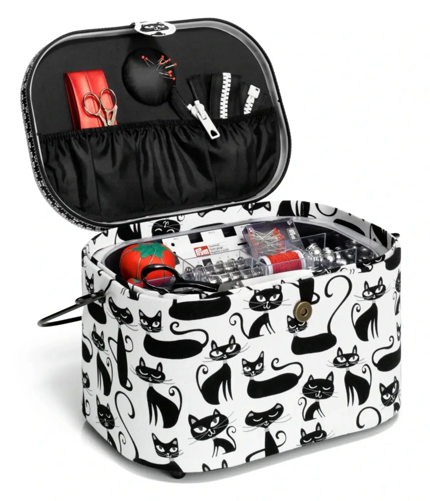 Košík PRYM si jednoducho zamilujete. Veľký košík na šitie Vás zaujme predovšetkým svojim elegantným designom. Kazeta na šijacie potreby v krásnom dizajne čiernobielych mačiek a vekom zdobeným krajčírskym metrom. Kazeta je čalúnená a mimoriadne priestranná. Má vyberateľné priehľadné poschodie so 7 priehradkami na drobnú galantériu. Na spodnej strane veka sú okrem ihelníčka aj dve vrecká na šijacie potreby. Kazeta má štýlovú čiernu kovovú rukoväť s drevenou úchytkou a praktické magnetické zapínanie. Košík bude ozdobou každej krajčírskej dielne a neprehliadnuteľný na kreatívnych kurzoch a kurzoch šitia.