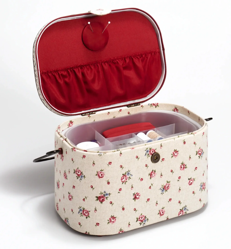 Košík PRYM si jednoducho zamilujete. Veľký košík na šitie Vás zaujme predovšetkým svojim štýlovým designom. Kazeta na šijacie potreby v krásnom dizajne romantických ruží a vekom zdobeným krajčírskym metrom. Kazeta je čalúnená a mimoriadne priestranná. Má priestranné vnútro a vyberateľné priehľadné poschodie so 7 priehradkami na drobnú galantériu. Na spodnej strane veka sú okrem ihelníčka aj dve vrecká na šijacie potreby. Kazeta má štýlovú čiernu kovovú rukoväť s drevenou úchytkou a praktické magnetické zapínanie. Košík bude ozdobou každej krajčírskej dielne a neprehliadnuteľný na kreatívnych kurzoch a kurzoch šitia.