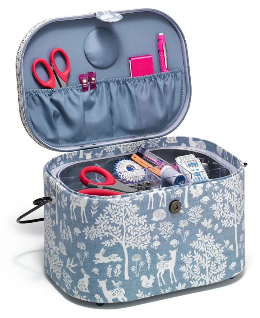 Košík PRYM si jednoducho zamilujete. Veľký košík na šitie Vás zaujme predovšetkým svojim kúzelným designom. Kazeta na šijacie potreby v krásnom dizajne lesa a vekom zdobeným krajčírskym metrom. Kazeta je čalúnená a mimoriadne priestranná. Má vyberateľné priehľadné poschodie so 7 priehradkami na drobnú galantériu. Na spodnej strane veka sú okrem ihelníčka aj dve vrecká na šijacie potreby. Kazeta má štýlovú čiernu kovovú rukoväť s drevenou úchytkou a praktické magnetické zapínanie. Košík bude ozdobou každej krajčírskej dielne a neprehliadnuteľný na kreatívnych kurzoch a kurzoch šitia.