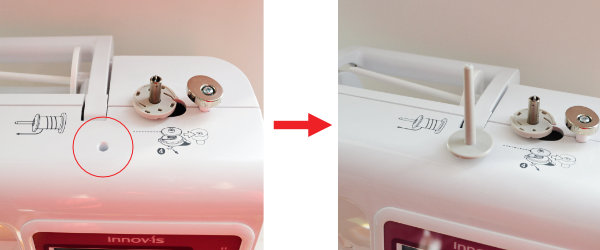 Kolík sa nenasadzuje na cievkovanie stroja, je určený na zastrčenie do diery v hornom kryte stroja.