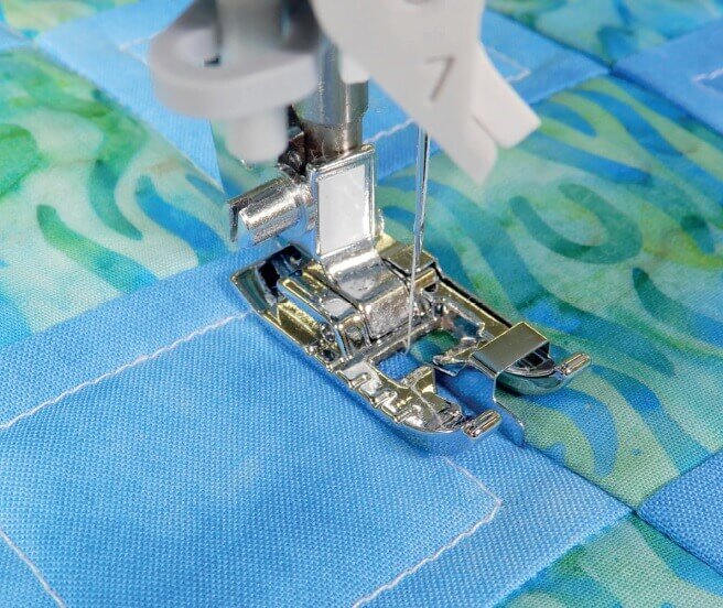 a prešívanie jednoduchých prekrytí. Táto prítlačná pätka má uprostred kratšie vodítko. Vďaka tomuto kratšiemu vodítku ponúka plynulejší posuv látky. Navyše sa od nej očakáva zníženie nerovnomerného podávania materiálu. Značky na ľavej strane slúžia ako vodítko na quiltovanie obrysov. Zmenou polohy ihly môžete ľahko šiť jednoduché prekrytie.