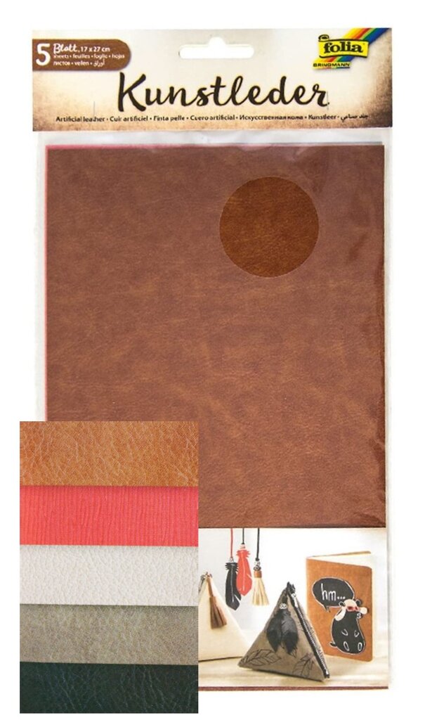 Koženka - 5 listov - 5 farieb (17x27 cm) je umelá koža určená na šitie a kreatívnu tvorbu. Balenie obsahuje 5 listov 17x27 cm a každý list má inú farbu.