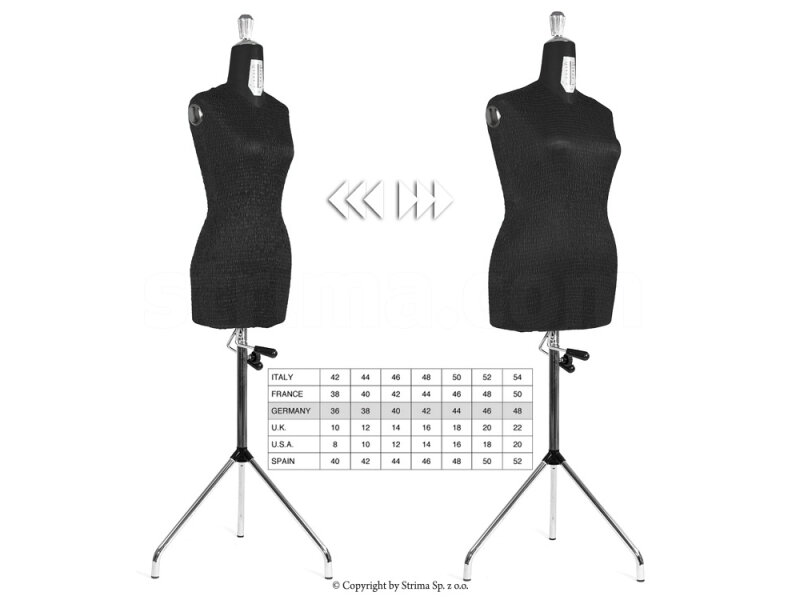 obchod@raj-sitia.skKrajčírska panna DRESS FORM PREMIUM (36-48) BLACK je kvalitná krajčírska panna s poniklovaným (kovovým) stojanom s nastaviteľnou výškou. Panna umožňuje nastavenie veľkosti v rozsahu 36 - 48 (štandardná používaná veľkosť). Táto krajčírska panna je vyrobená v Taliansku a jedná sa o vysoko kvalitnú krajčírsku pannu, ktorej výhodou je, že pri zmene veľkosti nevytvára telo žiadne medzery a diery na rozdiel od lacnejšie krajčírskych panien. Kovový gombík na krku figuríny slúži na nastavenie veľkosti, ktorá sa zobrazuje na krku panny. Otáčaním smerom hodinových ručičiek sa nastaví na najmenšiu veľkosť, otáčaním proti smeru hodinových ručičiek sa nastaví na veľkosť najväčšiu. Páčky v dolnej časti figuríny (ženy) slúžia prípadne na zvýšenie alebo zníženie hrude (prsia) a zväčšenie alebo zmenšenie hrude (prsia). Krajčírska panna má 100% bavlnený elastický poťah.