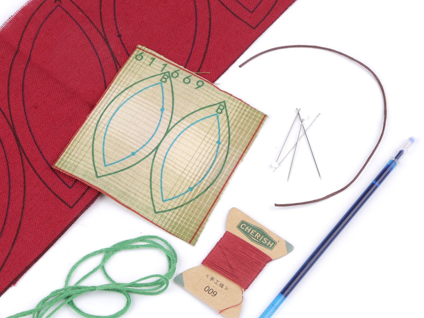Sada obsahuje: předtištěná plátna, jehly, nit, špendlíky, vyšívací přízi, mizící propisovací tužku na textil a fotonávod.