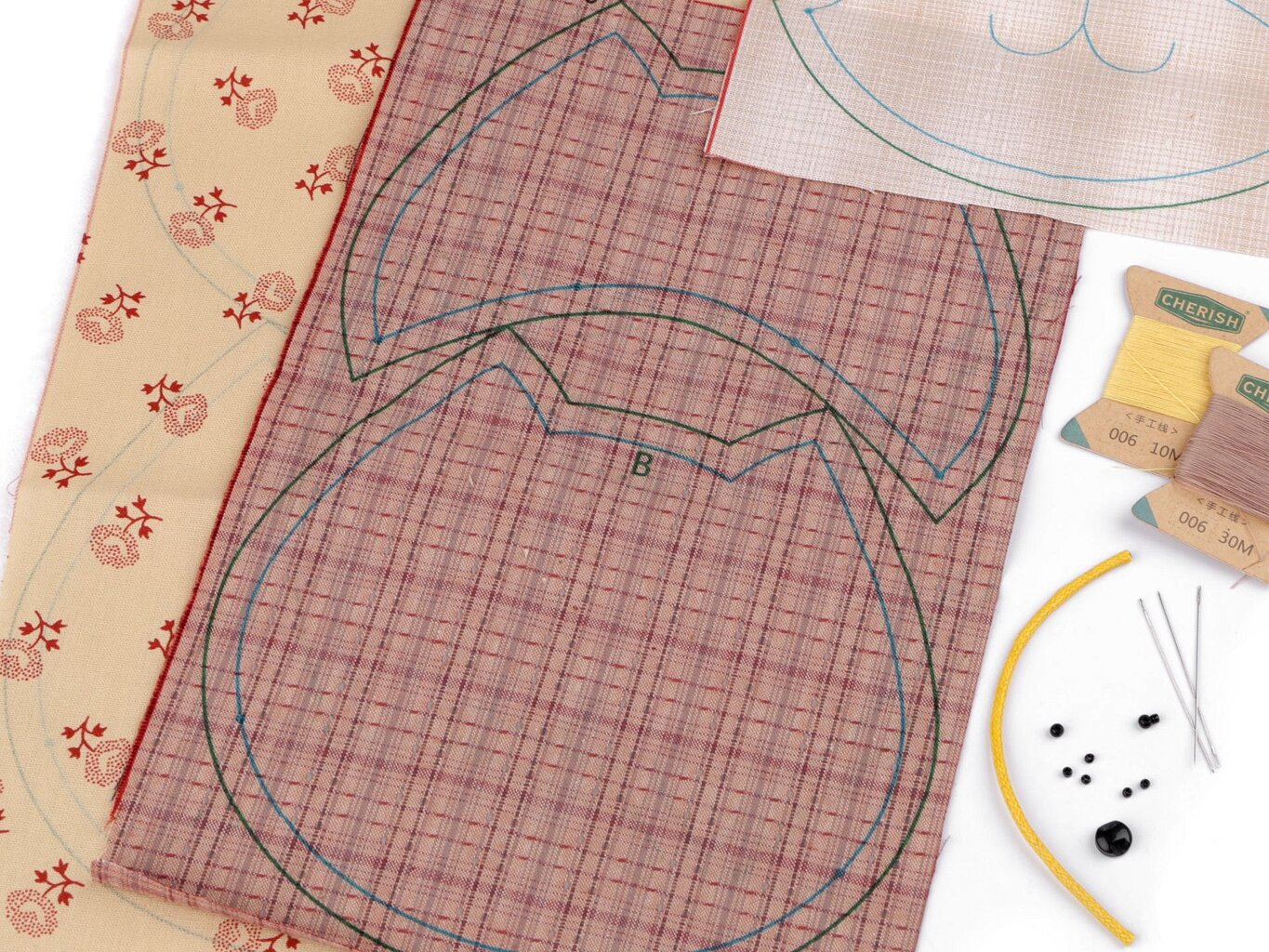 Sada obsahuje: předtištěná plátna, zpevňovací vycpávku, jehly, nitě, vyšívací přízi, zip, korálky, šňůrku, mizící propisovací tužku na textil a foto návod.