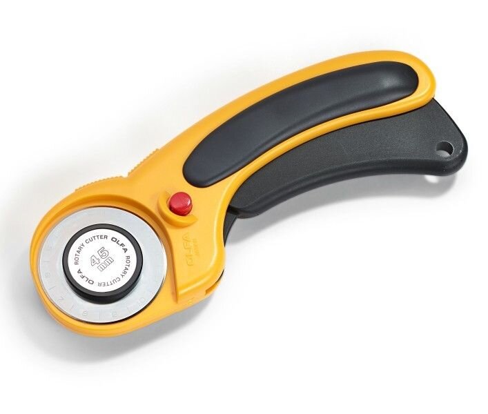 Kruhový rezač Olfa Comfort 45 mm od značky Prym. Bezpečné rezacie koliesko, ktoré dokáže prerezať až niekoľko vsrtev látky.